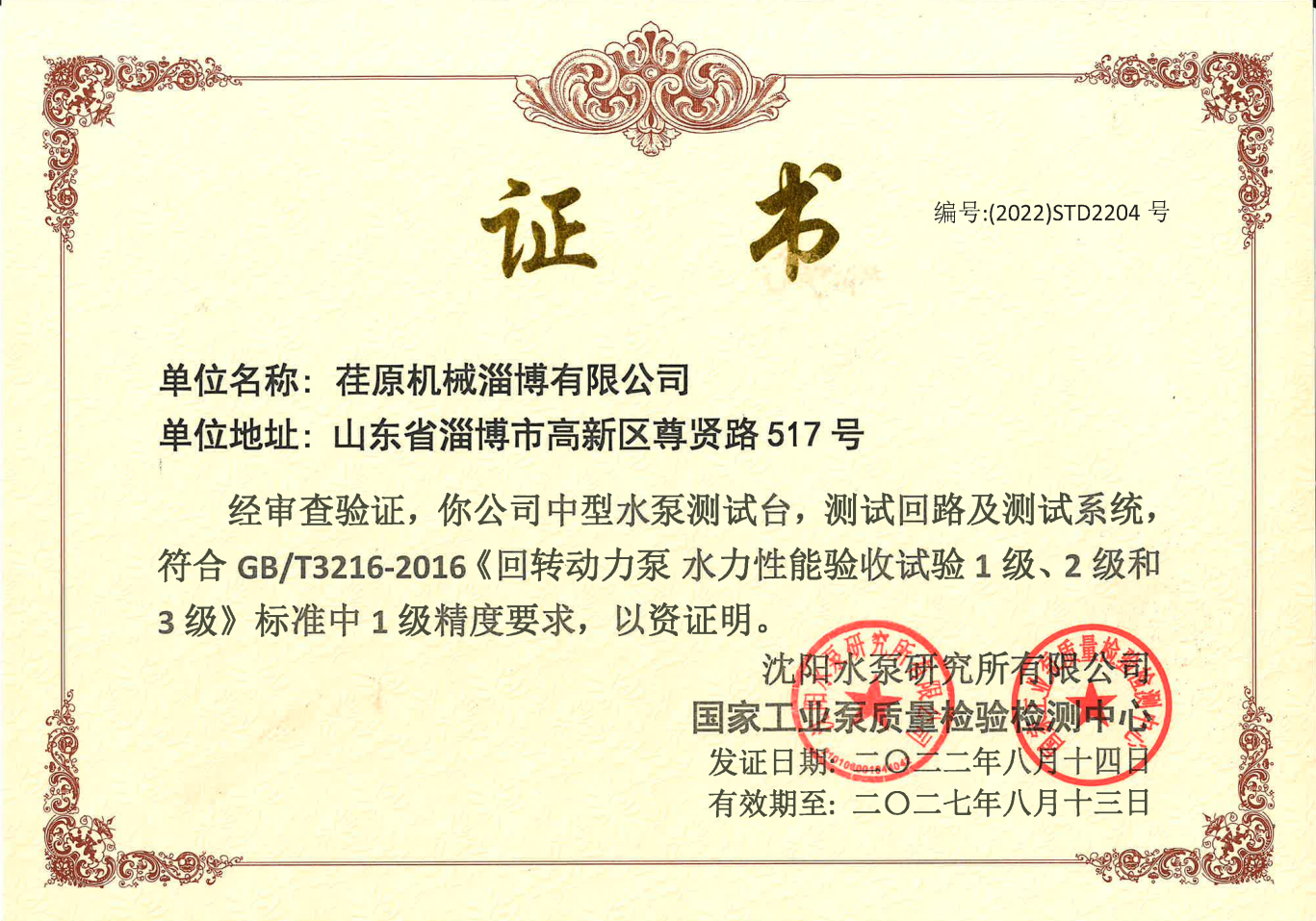 • 中型水泵試驗(yàn)臺(tái)及測(cè)試系統(tǒng)1級(jí)精度證書(shū)