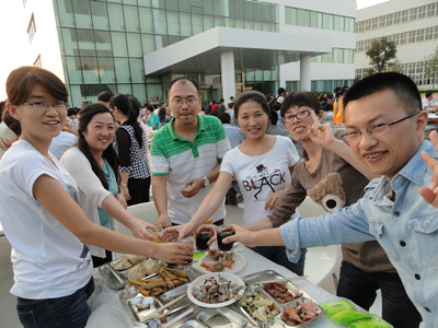 17:30分, “第四屆員工納涼晚會”正式開始。首先是員工聚餐。近400名員工,伴著歡快的樂曲聲,推杯換盞,大快朵頤。公司總經理志賀進、常務副總經理王正軍等公司領導走入員工中,與員工們親切交談,敬酒祝愿,整個會場洋溢著一張張歡樂的笑臉。